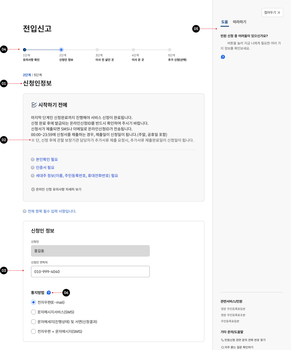 신청서 작성 중 어려움을 겪는 상황에서 사용자 스스로 문제를 해결할 수 있도록 여러 가지 도움말을 제공해야 한다. 도움말은 문의처를 포함하여 1가지 이상의 방식을 제공하는 것이 바람직하다.