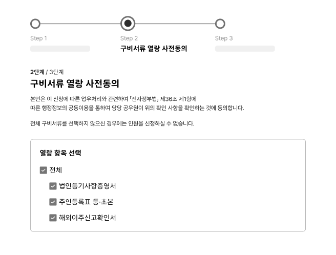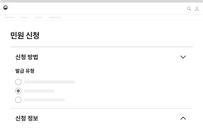 민원 신청 시 필요한 구비서류를 사용자가 직접 제출하지 않고 전산망에서 조회하여 처리할 수 있도록 행정정보 공동이용을 활용하여 사용자가 서비스 신청 시 첨부해야 하는 구비서류를 최소화한다. 이 경우 제출하지 않는 구비서류는 행정정보 공동이용을 통해 처리됨을 안내한다. 이를 통해 구비서류 준비에 소요되는 절차와 시간을 단축하고 신청 과정에서 발생할 수 있는 오류를 방지할 수 있다.