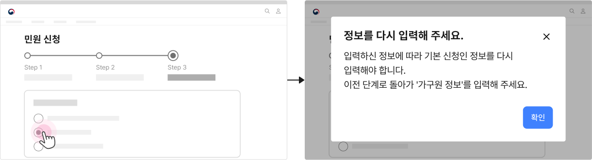 만약 구조적으로 신청서 내 입력 항목 중 다른 입력 항목에 영향을 미치는 항목을 선행하여 입력하도록 순서를 설계하기 어렵다면, 적어도 후행 항목 입력 후 선행 항목에 변경이 발생하였다는 사실에 대해 인라인 메시지로 사용자에게 안내해야 한다.