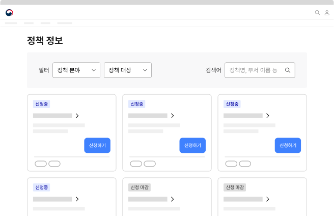 새로 시행되는 정책이나 중요 정책에 "신규", "중요"와 같은 메타 데이터를 배지로 제공함으로써 사용자가 시의성 있는 정책 정보를 탐색할 수 있도록 도와야 한다.